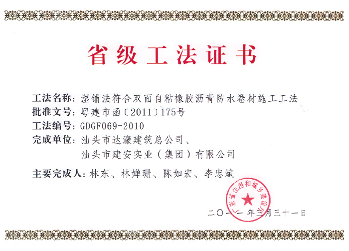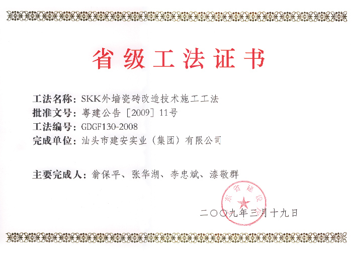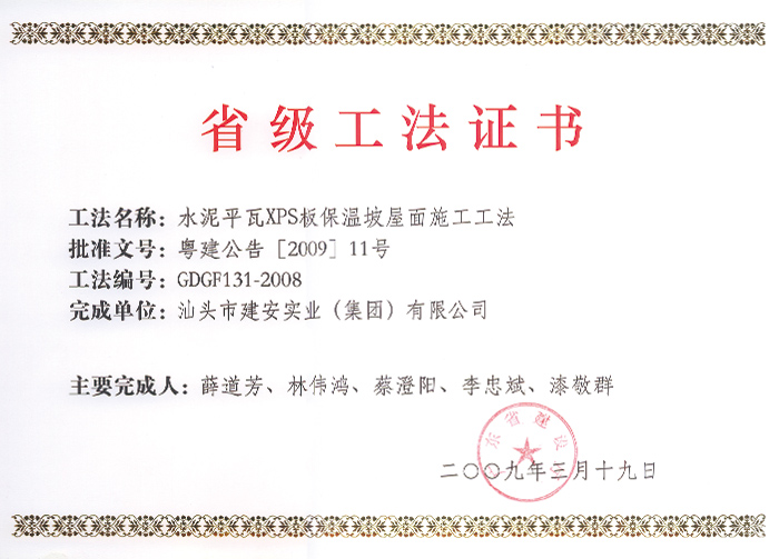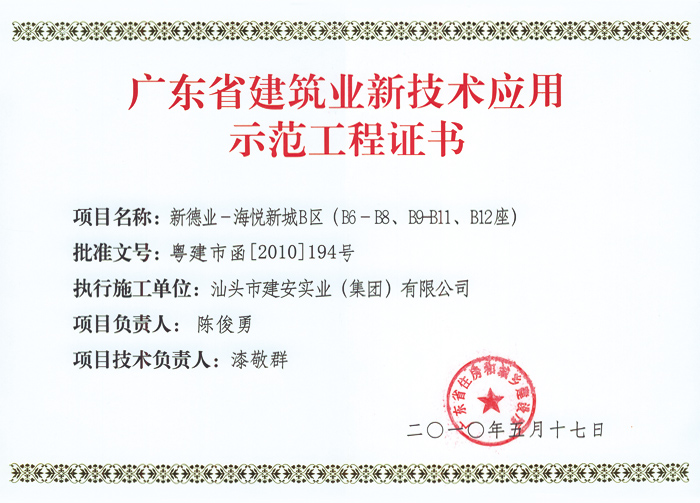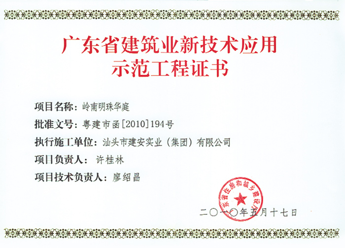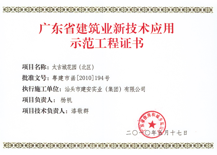 廣東省建筑業(yè)新技術(shù)應用示范工程證書(shū)